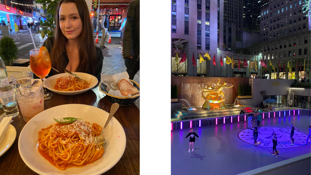 For dinner we headed out to the famous Little Italy. After our trip to Italy last year, we were desperate to enjoy some Italian food again. One thing to be aware of in New York is both the portion sizes and prices of food – it’s a lot! We’d been sharing meals for most of the trip so far so were planning on doing this again in Little Italy, but the restaurant we found had surprisingly decent-sized portions at a reasonable price. We were able to sit outside as the weather was still pretty good, which was really nice and something you don’t normally expect to do in New York. After dinner we headed back up to Midtown to visit the Rockefeller Center. This is always a nice place to visit at night, as the whole building is lit up. There was also a roller rink where the famous ice rink usually is, so we were able to watch some incredible rollerskaters dance under the city lights.