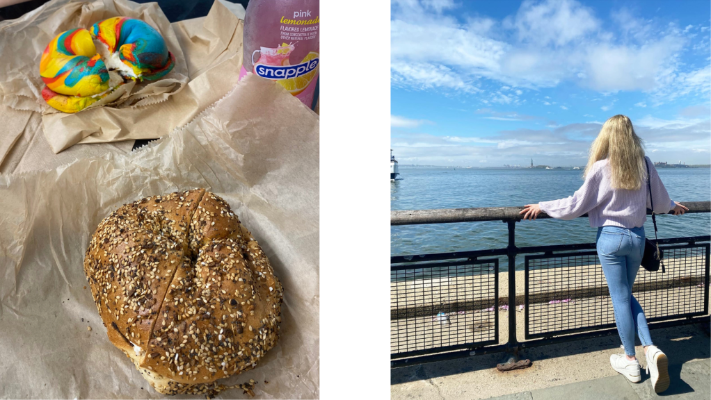 On our second day in the Big Apple, temperatures returned to normal. Our first stop was to get one of New York’s most famous food items: bagels. Liberty Bagels is known as the home of the rainbow bagel, and their impressive selection of cream cheese. I got the everything bagel with lox cream cheese, which was soooo good. This kept us going for our morning adventures; Lower Manhattan was on our list today. Our first stop was Battery Park, where we got our first glimpse of the Statue of Liberty. We noticed a lot of people trying to sell Liberty Island tours outside the subway station, but we went for the Staten Island Ferry, which is free and gives you great views of both the Statue of Liberty and also the Lower Manhattan skyline.