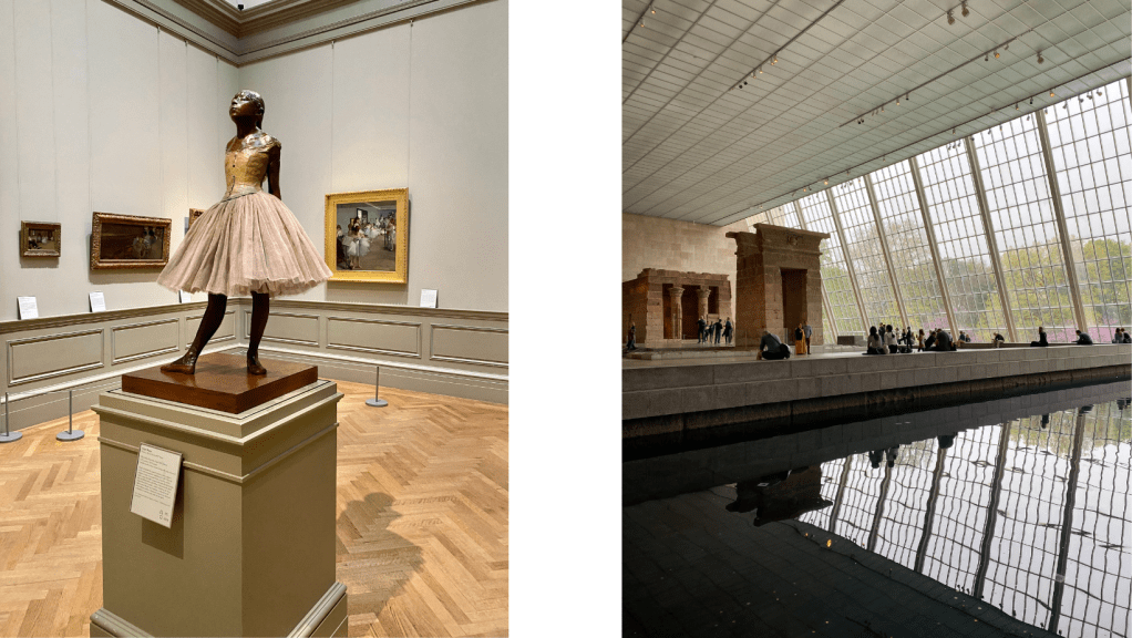 Our last full day in NYC was our one rainy day of the trip, and even then it wasn’t actually as bad the forecast said it would be! We decided to have a museum morning, visiting the Metropolitan Museum of Art for a few hours. You can easily spend a whole day in the Met, as there’s so much to see. Art from all around the world, from Europe to Asia, was on display, including Ancient Green and Roman statues, paintings by my favourite artist Monet and also ‘The Little Fourteen-Year-Old Dancer’ by Degas. It’s a fantastic museum, with so many different historical periods and cultures to explore. One thing to note is that the cafes inside are not cheap, we ended up finding a nearby Shake Shack for lunch!