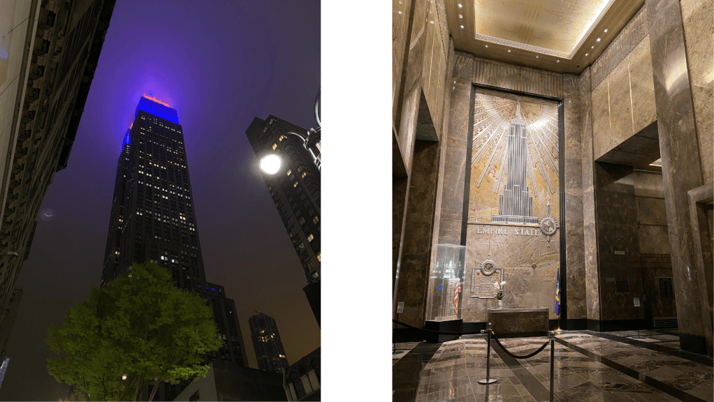 We ended the day by having dinner in Blaggard’s Pub, an Irish-style pub with great food and surprisingly cheap drinks. We also made a quick stop at the Empire State Building, which was lit up in orange and blue to mark the New York Knicks’ first game of the season (according to their website!). Fog had settled over the city that evening, which meant that the top of the skyscraper was hidden in the clouds. We also snuck inside for a quick look at the lobby’s beautiful art deco design – although we didn’t visit the observation deck, it was great to still go inside this famous building.